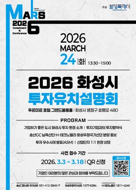(플러스인뉴스) 화성특례시가 오는 3월 24일 푸르미르 호텔에서 ‘2026 화성특례시 투자유치 설명회’를 개최하고, 3월 3일부터 3월 18일까지 QR코드를 통한 사전접수를 진행한다.