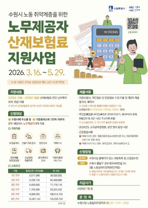 (플러스인뉴스) 수원특례시는 5월 29일까지 ‘2026년 상반기 노동 취약계층 노무제공자 산재보험료 지원사업’ 신청을 받는다.