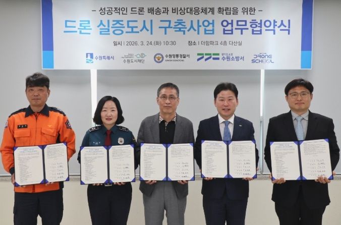이날 협약식에는 오민범 수원시 에이아이(AI)스마트정책국장, 수원도시재단 이사장, 수원영통경찰서 관계자, 수원소방서 관계자, ㈜드론스쿨인터네셔널 대표 등이 참석했다. 참석자들은 드론배송 서비스의 안정적 운영과 비상 대응체계 구축을 위한 협력 방안을 공유했다.