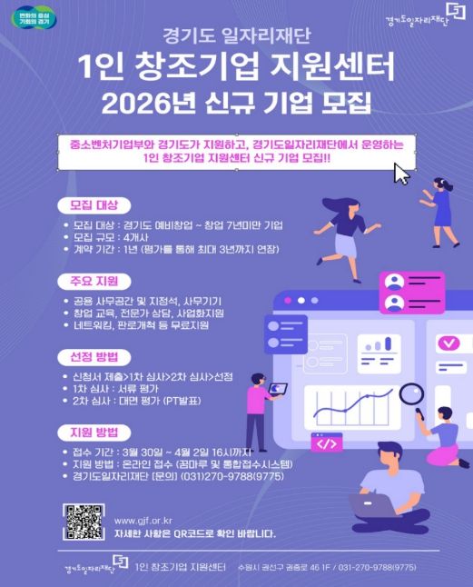 (플러스인뉴스) 경기도일자리재단은 창업자와 예비 창업자에게 사무공간과 사업화를 지원하는 ‘1인 창조기업 지원센터’ 참여기업을 30일부터 모집한다.