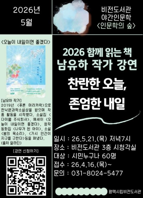(플러스인뉴스) 평택시립 비전도서관은 오는 5월 21일 저녁 7시 남유하 작가를 초청하여 ‘찬란한 오늘, 존엄한 내일’을 주제로 야간 인문학 강연을 진행한다.