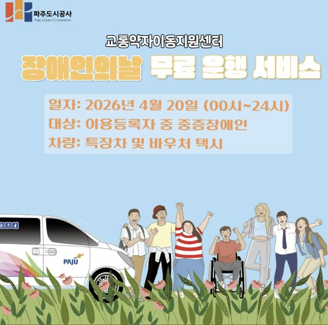 (플러스인뉴스) 파주도시공사 교통약자이동지원센터에서는 오는 4월 20일 장애인의 날을 맞아 교통약자를 위한 무료 운행 서비스를 실시한다.