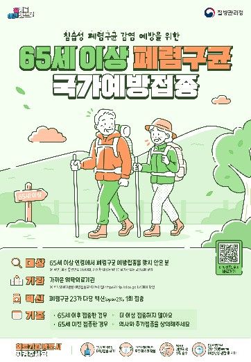 폐렴구균 예방접종은 65세 이상을 대상으로 평생 1회 무료 지원되고 있으며, 주소지와 관계없이 가까운 위탁의료기관에서 접종받을 수 있다.