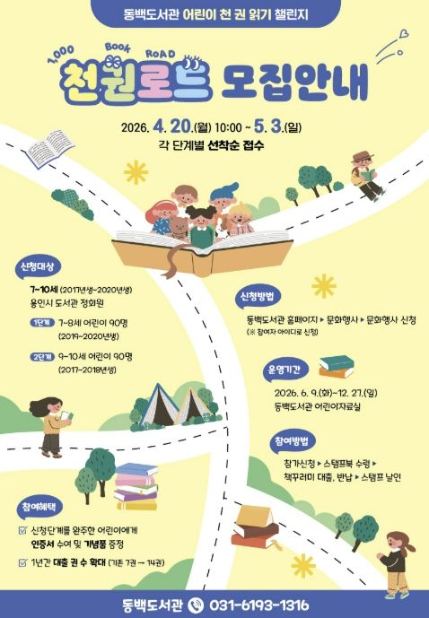 (플러스인뉴스) 용인특례시 동백도서관은 어린이 천 권 읽기 챌린지 ‘천권로드(ROAD)’ 참여자를 모집한다고 20일 밝혔다.