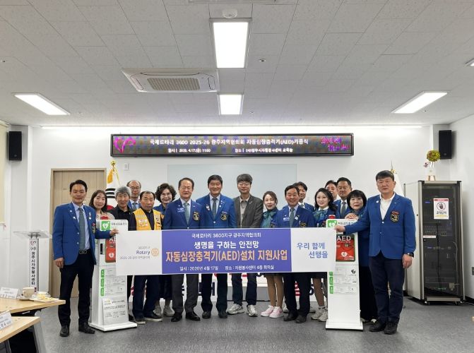 (플러스인뉴스) 국제로타리 3600지구 2025-26 광주지역협의회는 지난 17일 광주시자원봉사센터 4층 교육장에서 자동심장충격기 기증식을 개최하고 500만 원 상당의 장비 2대를 전달했다.
