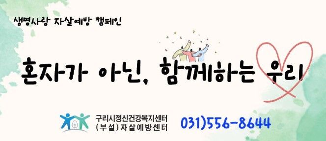 한편, 도움이 필요한 구리 시민은 구리시정신건강복지센터 부설 자살예방센터를 통해 상담과 서비스를 받을 수 있으며, 자세한 사항은 홈페이지에서 확인할 수 있다.