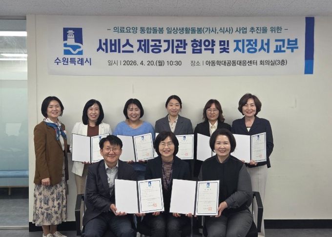 수원시는 20일 아동학대공동대응센터 회의실에서 ‘의료요양 통합돌봄 일상생활돌봄(가사·식사) 서비스 제공기관’ 7개소(가사4·식사3)와 업무협약을 체결하고 지정서를 교부했다.