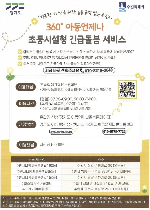 ‘초등시설형 긴급돌봄 서비스’는 갑자기 아동 돌봄이 필요할 때 요긴하다. 예상하지 못했던 출장이나 야근으로 퇴근이 예정보다 늦어지는 경우와 같은 돌발 상황에 모두 이용할 수 있다. 주말이나 휴일, 자정까지의 야간 시간 등은 물론 등교 전인 오전 7시부터 서비스를 제공한다. 장안구 2곳(연무동, 파장동), 권선구 1곳(호매실동), 팔달구 1곳(매교동), 영통구 1곳(매탄동) 등 총 5개 돌봄 기관에서 최대 8시간을 맡아준다. 경기도 아동언제나돌봄 홈페이지에서 온라인 신청할 수 있고, 경기도아동돌봄수원센터에 전화 신청할 수도 있다. 이용요금은 시간당 5천원이다.