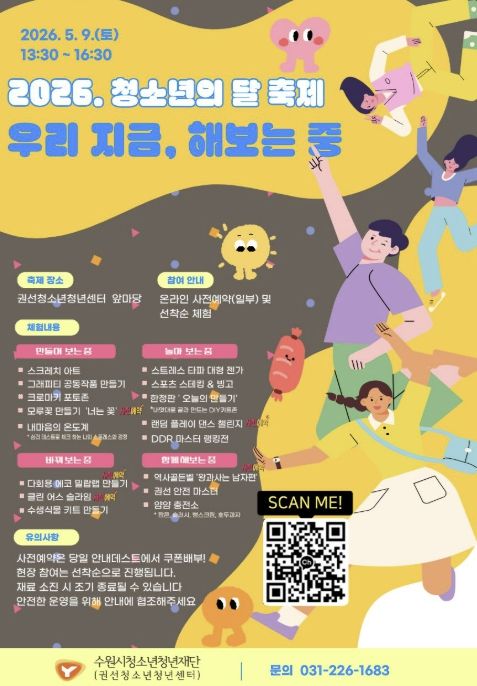 (플러스인뉴스) 수원시청소년청년재단 권선청소년청년센터가 오는 5월 9일, 청소년이 주인공이 되어 직접 경험하고 도전하는 참여형 축제 ‘지금우리, 해보는중’을 개최한다고 밝혔다.