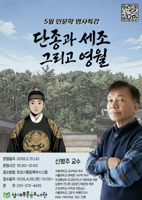 (플러스인뉴스) 화성시문화관광재단 운영하는 왕배푸른숲도서관이 오는 5월 13일, 지역 주민들을 위해 역사학자 신병주 교수를 초청하여 5월 인문학 명사특강을 개최한다.