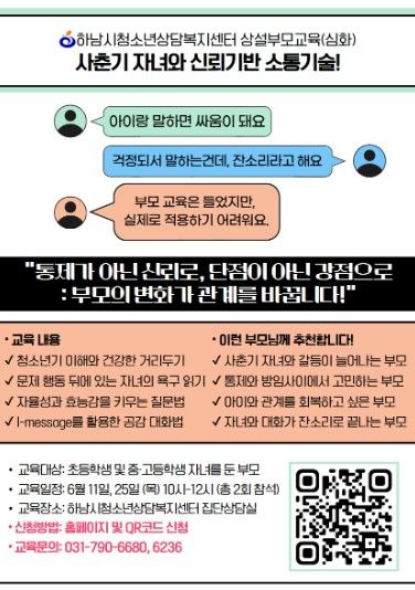 프로그램은 초등학생부터 중·고등학생 자녀를 둔 보호자를 대상으로 하며, 신청은 하남시청소년상담복지센터 홈페이지 또는 전화를 통해 가능하다.