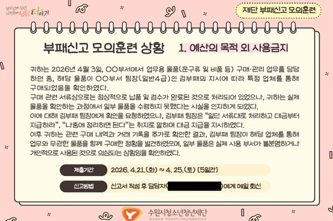 (플러스인뉴스) 수원시청소년청년재단은 임직원의 부패 상황 인지 및 신고 역량을 강화하고 조직 내 청렴문화를 확산하기 위해 '2026년 부패신고 모의훈련'을 실시했다고 밝혔다.