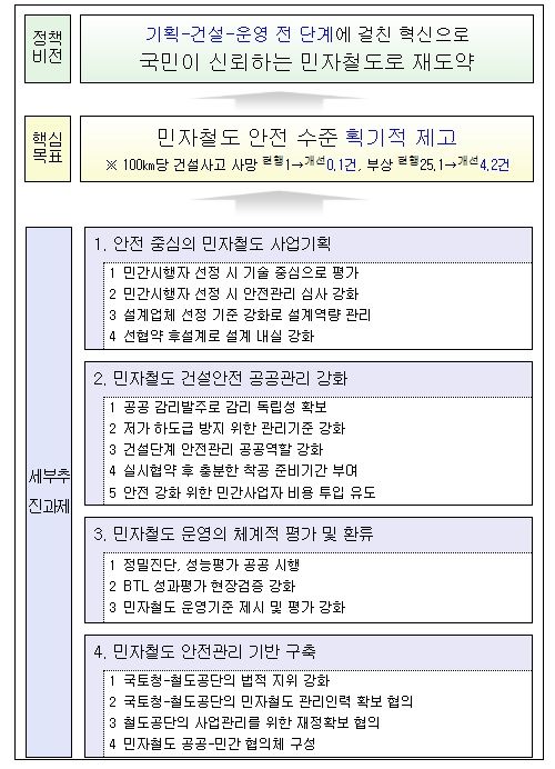 그간 민자철도는 철도수요 증가와 제한된 정부재정 하에서 민간의 자본과 창의를 토대로 철도 인프라를 효율적으로 확대하는데 기여해왔으나, ➊공사비 절감과 공기 단축 등 효율성 중심의 사업 관리, ➋시공사가 사실상 시행자 역할을 병행하며 발생하는 자기감독 구조, ➌민자사업관리를 부수적 업무로 인식하는 공공의 소극성 등으로 민자철도 안전관리가 상대적으로 소홀했다는 지적이 있었다.