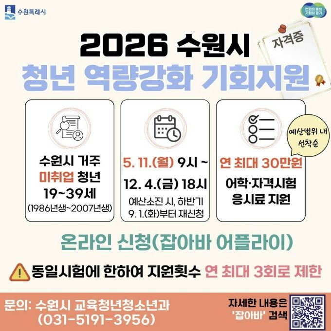 (플러스인뉴스) 수원특례시는 미취업 청년의 취업 준비 비용 부담을 덜어주는 ‘청년 역량강화 기회 지원 사업’을 12월 4일까지 운영한다. 미취업 청년에게 어학·자격시험 응시료를 1인당 연 최대 30만 원 지원한다.