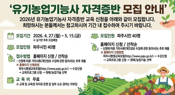 (플러스인뉴스) 파주시농업기술센터는 친환경농업 분야 농업 전문 인력 육성을 위한 '2026년 유기농업기능사 자격증 취득’교육생을 4월 27일부터 5월 15일까지 모집한다.