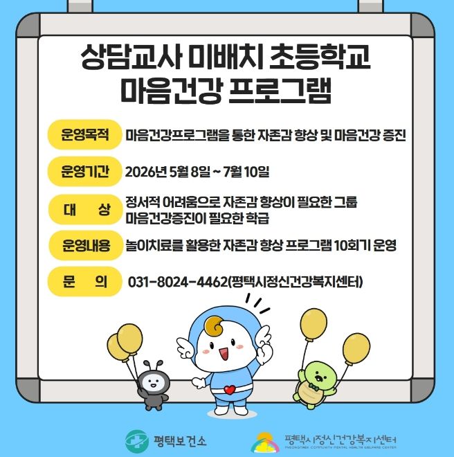 (플러스인뉴스) 평택시는 상담교사가 배치되지 않은 초등학교 학생들의 정신건강 지원을 위해 ‘마음건강 프로그램’을 운영한다고 밝혔다.