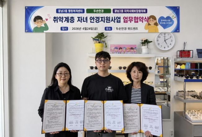 (플러스인뉴스) 광주시 광남2동 행정복지센터와 지역사회보장협의체는 지역 안경업체 두 손 안경 위드렌즈와 함께 취약계층 아동·청소년의 시력 보호와 학습환경 개선을 위한 안경 지원사업 업무협약을 체결했다고 28일 밝혔다.