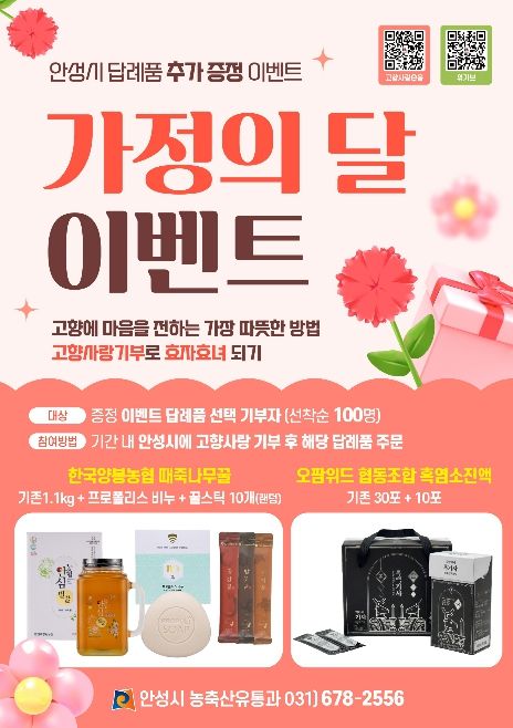 (플러스인뉴스) 안성시는 오이데이와 5월 가정의 달을 맞아 고향사랑기부제 참여 확대와 지역 농산물 소비 촉진을 위해 ‘오이데이 이벤트’와 ‘가정의 달 이벤트’를 추진한다고 밝혔다.