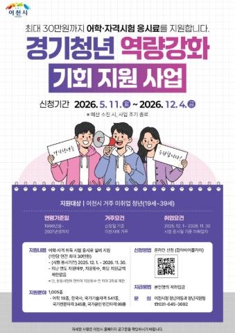 (플러스인뉴스) 이천시가 오는 5월 11일부터 미취업 청년의 어학·자격시험 응시료를 지원하는 ‘경기청년 역량강화 기회지원 사업’ 대상자 모집에 들어간다.
