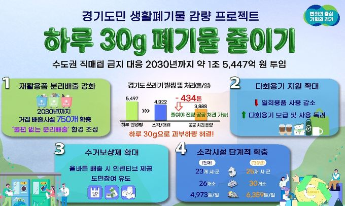 (플러스인뉴스) 수도권 직매립 금지에 따른 생활쓰레기 감량을 위해 경기도가 2030년까지 5년간 약 1조 5,447억 원을 투입하는 ‘하루 30g, 도민실천형 생활폐기물 감량 프로젝트’를 추진한다.