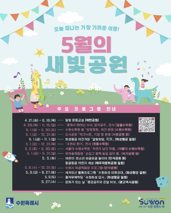 수원시 관계자는 “가정의 달 5월을 맞아 시민들이 가까운 공원에서 자연과 문화를 함께 즐길 수 있도록 다양한 프로그램을 준비했다”며 “전 세대가 함께 누릴 수 있는 공원 중심 문화 콘텐츠를 확대해 나가겠다”고 말했다.