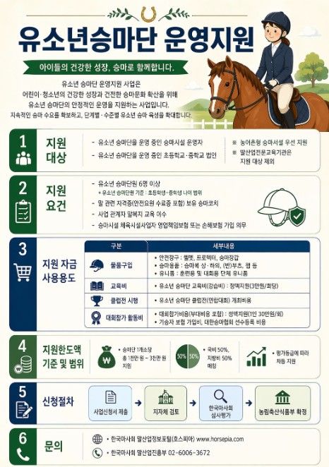 농식품부와 지방정부는 유소년 승마단을 운영하는 승마장 및 초등학교‧중학교 법인에게 안전한 훈련과 클럽전 개최, 유소년 승마대회 참가 등을 위해 필요한 운영비용을 1개소당 연간 최대 3천만원까지 지원할 계획이다.