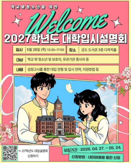 (플러스인뉴스) 안성시학교밖청소년지원센터는 학교 밖 청소년의 성공적인 진학을 돕기 위해 오는 5월 28일 오후 1시 30분부터 공도 도서관 다목적홀에서 ‘2027학년도 대학 입시 설명회’를 개최한다고 밝혔다.