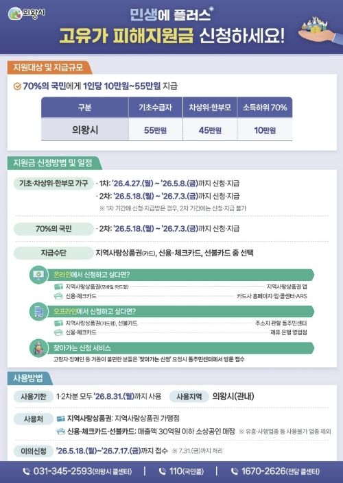 (플러스인뉴스) 의왕시가 최근 중동 전쟁 여파로 인한 고유가·고환율·고물가로 어려움을 겪는 시민들을 지원하기 위해 추진 중인 '고유가 피해지원금' 지급 사업이 시행 초기부터 순조롭게 진행되고 있다.