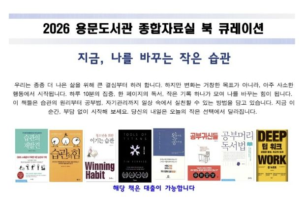이번 도서 추천 서비스(북 큐레이션)는 일상 속 작은 변화와 꾸준한 실천을 통해 자기 계발과 삶의 질 향상을 돕기 위해 기획됐으며, 바쁜 현대인이 실천할 수 있는 습관 형성 방법과 학습·자기 관리 전략을 자연스럽게 접할 수 있도록 구성됐다.