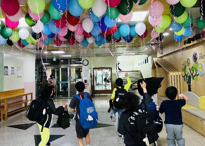 이날 등굣길에는 탈인형이 등장해 학생들을 맞이하며 활기찬 분위기를 조성했다. 또한 자동 분사되는 비눗방울 장치가 설치돼 학교 앞은 동화 같은 풍경으로 연출됐다.