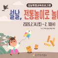 (플러스인뉴스) 경기문화재단 경기도어린이박물관은 설날을 맞이하여 2026년 2월 14일부터 2월 18일까지 설날 특별프로그램 '설날, 전통놀이로 놀아요!'를 운영한다. 설 연휴 동안 박물관을 방문하는 어린이와 동반 가족을 위해 가족 간의 유대감을 높일 수 있는 전통문화 체험프로그램 3종을 준비했다. 프로그램은 ‘짚풀로 뚝딱! 꽃팽이랑 제기랑’, ‘엄마 아빠와 함께! 오순도순 윷놀이’, ‘복을 쏙쏙! 투호놀이’ 등으로 구성되어 있다. ‘짚풀로 뚝딱! 꽃팽이랑 제기랑’ 프로그램은 풀짚공예박물관과 협력하여 진행되는 프로그램으로 전통적인 만들기 재료인 풀짚을 사용하여 팽이와 제기를 직접 만들어본다. 삼과 부들풀에 대해 알아보고 직접 만든 팽이와 제기를 가지고 전통놀이를 즐길 수 있다. ‘엄마 아빠와 함께! 오순도순 윷놀이’ 프로그램은 방문객 누구나 참여가능한 자율체험 프로그램으로 우리 나라의 대표적인 민속놀이인 윷놀이를 온가족이 함께 해볼 수 있다. ‘복을 쏙쏙! 투호놀이’ 프로그램 또한 방문객 누구나 참여가능한 자율체험 프로그램으로 궁궐과 양반 집안에서 주로 행해지던 전통놀이인 투호놀이를 즐길 수 있다. 놀이방법이 간단하여 어린 아이부터 어