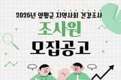 (플러스인뉴스) 양평군은 질병관리청 및 양평군보건소와 공동으로 추진하는 ‘2026년 지역사회 건강조사’에 참여할 조사원 6명을 모집한다고 밝혔다. 지역사회 건강조사는 지역 주민의 건강 수준과 생활 습관, 만성질환 현황 등을 파악해 지역 특성에 맞는 보건 정책 수립의 기초 자료로 활용하기 위해 매년 실시되는 국가승인통계다. 이번 조사는 5월 16일부터 7월 31일까지 약 2개월 반 동안 진행되며, 조사 진행 상황에 따라 종료일은 변경될 수 있다. 모집 분야는 ‘2026년 지역사회 건강조사 조사원’으로, 근무 지역은 양평군 관내이며 모집 인원은 총 6명이다. 선발된 조사원은 조사 수행에 앞서 표본지점 확인을 위한 사전 조사를 실시하고, 조사 대상 가구로 선정된 표본가구를 직접 방문해 19세 이상 성인을 대상으로 스마트 기기(태블릿 PC)를 활용한 1대1 면접 조사를 수행하게 된다. 전형은 1차 서류 전형과 2차 면접 전형으로 진행된다. 군은 서류 전형에서 응시자의 자격 및 경력의 적합 여부를 심사하며, 1차 합격자를 대상으로 면접 전형을 실시한다. 원서 접수 기간은 3월 5일부터 13일까지이며, 본인이
