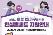 (플러스인뉴스) 성남시는 여성 1인 가구의 범죄예방과 안전한 주거생활을 위해 ‘안심 홈세트 3종’을 지원한다고 16일 밝혔다. 지원 품목은 스마트 도어벨, 홈캠, 문열림 센서다. 대상은 성남시에 사는 여성 1인 가구 또는 한부모(모자, 부녀)가족이면서 전월세 보증금 3억원 이하의 다가구·다세대 주택 거주자다. 지원 물량은 44가구다. 시는 신청자의 자격요건 확인 뒤 대상 가구에 안심 홈세트를 선착순으로 지원한다. 희망자는 오는 4월 20일부터 성남시 홈페이지(시정소식→새소식) 또는 경기민원24 홈페이지(여성 1인가구 안심패키지 지원사업)를 통해 신청서와 임대차계약서 사본을 첨부해 보내면 된다. 시청 6층 여성가족과를 방문 접수하거나 담당자 이메일로 해당 서류를 보내도 된다. 성남지역 1인 가구 수는 3월 말 기준 전체 41만325가구의 39%인 16만661가구다. 이 중 여성 1인 가구는 48%인 7만7845가구다. 성남시는 2021년도부터 이 사업을 펴 지난해까지 5년간 576가구에 안심 홈세트를 지원했다. [뉴스출처 : 경기도 성