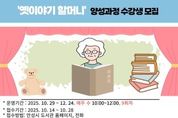 (플러스인뉴스) 안성시 중앙도서관은 오는 10월 29일부터 12월 24일까지 매주 수요일 오전 10시부터 12시까지(총9회) 진행되는 『옛이야기 할머니』양성과정의 수강생을 모집한다. 이번 과정은 우리 전통 설화와 구전문화를 이해하고, 이를 바탕으로 어린이들에게 옛이야기를 들려줄 수 있는 이야기 구연 역량을 키우는 특화 교육 프로그램으로 교육은 송경애 강사(한국국학진흥원 및 아름다운 이야기 할머니 교육강사)가 진행하며, 이야기 전달 기법, 발성 훈련, 스토리텔링 실습 등 실질적인 교육 중심으로 구성된다. 참여 대상은 60세 이상 여성 20명으로, 접수는 10월 14일부터 도서관 홈페이지, 전화 또는 방문을 통해 신청할 수 있다. 도서관 관계자는 “지역 어르신들이 삶의 지혜와 전통 이야기를 전하며 세대 간 소통의 다리를 놓는 뜻깊은 과정이 될 것이고 본 과정을 수료한 참여자들은 2026년 ‘책 읽어주기’ 자원봉사 프로그램에 참여할 수 있도록 안내할 계획이다.”라고 전했다. [뉴스출처 : 경기도 안성시]