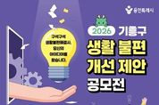 (플러스인뉴스) 용인특례시 기흥구는 오는 6일부터 5월 4일까지 ‘2026 기흥구 생활불편개선 제안 공모전’을 개최한다. 이번 공모전은 일상에서 시민이 직접 체감하는 불편사항을 발굴하고, 이를 개선할 수 있는 다양한 방안을 모색하고자 마련됐다. 주제는 일상생활에서 체감하는 생활 불편 개선 아이디어다. 시설·환경 등 각종 생활 불편 사항이나 비효율적인 행정이나 규제 등 다양한 분야의 의견을 받는다. 생활 불편에 관심 있는 누구나 참여할 수 있다. 시 누리집 ‘용인소식’의 ‘고시공고’ 또는 기흥구 누리집 ‘참여광장’의 ‘기흥소식’에서 서식을 내려받아 작성하면 된다. 작성한 제안은 방문‧우편(기흥구 관곡로 95 기흥구청 별관 2층 자치행정과 기획감사팀)으로 내면 된다. 전자우편으로도 제출할 수 있다. 부서 검토와 제안공모심사위원회 검토를 거쳐 최종 선정된 제안은 시상금(최대 100만 원)이 지급된다. 또 관련 부서 검토 등을 거쳐 행정에 반영하거나 실효성 있는 정책으로 이어질 수 있도록 추진할 방침이다. 자세한 사항은 시 또는 구 누리집에서 확인할 수 있