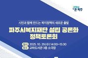 (플러스인뉴스) 파주시는 오는 29일 14시, 교하도서관 3층 소극장에서 ‘파주시복지재단 설립 공론화 정책토론회’를 개최한다고 밝혔다. 이번 토론회는 파주시복지재단 설립을 앞두고 시민, 전문가, 현장 종사자의 다양한 의견을 수렴해 재단 설립의 필요성과 발전 방향을 함께 모색하기 위해 마련됐다. 토론회는 김민철 서영대학교 사회복지행정학과 교수의 기조 강연을 시작으로, 파주시 복지기획팀장의 주제 발표가 이어진다. 이어 한지원 두원공과대학교 교수가 좌장을 맡아 토론을 진행하며, 이보경 파주시문산종합사회복지관 관장, 오민수 경기복지재단 선임연구위원, 박윤근 화성시복지재단 사업본부장 등이 참석해 열띤 논의를 펼칠 예정이다. 토론에서는 ▲파주시복지재단 설립의 필요성과 추진 개요 ▲파주시 여건을 반영한 복지재단의 발전 방향 ▲재정 자립 및 지속가능성 확보 방안 등 다양한 주제가 심도 있게 논의될 예정이다. 김은숙 복지정책국장은 “파주시복지재단은 시민의 삶을 보다 세밀하게 지원하고, 지역 현장의 목소리를 반영한 ‘파주형 복지모델’을 실행할 구심점이 될 것”이라며, “이번 토론회를 통해 파주시 복지 정책의 새로운
