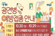 (플러스인뉴스) 파주시는 반려견을 동반한 야외활동이 잦아지는 가을을 맞아 오는 20일부터 29일까지 생후 3개월 이상의 임신하지 않은 개를 대상으로 광견병 예방접종을 실시한다고 밝혔다. 광견병은 바이러스에 의해 사람과 동물 모두에게 감염될 수 있는 인수공통전염병으로, 잠복기가 상당히 길고 증세가 나타날 경우 치사율이 매우 높기 때문에 사람과 반려동물 모두를 위해 반려견은 매년 1회 반드시 예방접종할 것을 적극 권장하고 있다. 시는 하반기 광견병 예방사업을 위해 예방백신 4,500마리 분을 무상 지원하며, 예방접종을 희망하는 반려견 보호자는 33개 지정 동물병원을 방문해 시술비 1만 원만 부담하면 접종이 가능하다. 참여 동물병원 목록은 파주시청 누리집 공고문을 통해 확인할 수 있다. 동물병원이 없는 읍면지역은 시에서 직접 수의사를 파견해 순회접종을 진행하며, 이 경우 접종비 전액을 시에서 지원할 방침이다. 읍면지역 순회접종 일정은 해당 읍면 행정복지센터 산업팀에 문의하면 된다. 아울러 파주시는 야생동물의 광견병 전파를 막기 위해 광견병 미끼백신을 너구리 등 야생동물이 자주 출몰하는 관내 야산에 살포하