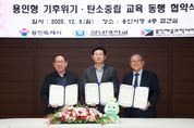 (플러스인뉴스) 용인특례시는 8일 시청 접견실에서 강남대학교, 용인예술과학대학교와 ‘용인형 기후위기·탄소중립 교육 동행 협약’을 체결했다. 이날 협약식은 기후위기에 공동으로 대응하고, 지속가능한 지역사회 발전과 미래 세대 양성을 위해 마련됐다. 협약의 주요 내용은 ▲탄소중립‧기후 위기 대응 교육프로그램 공동 개발‧운영 ▲교육봉사‧멘토링 등 교원‧전문가‧학생 간 교류와 연계 활동 지원 ▲지역사회 대상 탄소중립 홍보‧캠페인‧체험 교육 공동 추진 ▲교육시설‧인프라 상호 활용 등이다. 협약에 따라 시와 두 대학은 탄소중립 사회 실현을 위한 교육 모델을 구축한다는 방침이다. 각 대학의 유아교육과 인력과 연계해 교육봉사 기회를 확대하고, 신규 프로그램을 공동 개발해 용인지역 학생들을 탄소중립 실천 의지를 가진 인재로 육성하고, 시민의 환경 감수성을 높이는 데도 이바지하겠다는 계획이다. 이에 따라 오는 12일 용인예술과학대 유아교육과 연극동아리가 기후변화체험교육센터에서 아동 30명을 대상으로 관련 연극을 진행한다. 이상일 시장은 “기후 위기는 글로벌 차원의 가장 중대한 문제인 만큼 기후