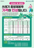 (플러스인뉴스) 평택시는 2026년 1월 1일부터 쓰레기 종량제 봉투 가격을 3개년도에 걸쳐 인상한다. 그동안 평택시는 인구증가, 물가상승, 생활 쓰레기 수집 운반 처리비용 증가에도 불구하고 2006년 이후 종량제봉투 가격을 동결해 왔다. 시 관계자는 “현재 평택시의 종량제 가격은 경기도 31개 시군 가운데 최하위 수준이며, 청소예산 재정자립도와 주민부담률이 낮아 가격 인상은 불가피하다”고 밝혔다. 따라서, 대표적으로 일반용 종량제봉투 20리터는 현재 500원에서 110원 인상된 610원으로, 음식물 전용 봉투 1.5리터는 현재 40원에서 20원이 인상된 60원으로, 공동주택에 설치된 음식물종량제기기(RFID)는 1㎏ 단위로 현재 48원에서 12원 인상된 60원으로, 경기도 내 31개 시군 평균 가격을 반영하여 인상안을 마련했다. 다만, 서민경제의 어려움과 시민부담을 고려하여 가격 인상은 3개년도에 걸쳐 단계적으로 시행할 예정으로, 시 관계자는 “종량제봉투 가격 인상에 대한 시민 여러분의 많은 이해와 협조를 부탁드린다”며 “앞으로도 쾌적하고 청결한 도시환경 조성은 물론 질 높은 청소행정 서비스 제공