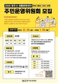 (플러스인뉴스) (재)광주시문화재단은 광주시 생활문화센터(만선·광남·고산·신현)에서 2026년에 활동할 주민운영위원회 위원을 통합 공개 모집한다고 밝혔다. 광주시문화재단은 2023년도 만선·광남 생활문화센터를 개관하고 주민운영위원회를 구성하고 운영해 왔다. 이번 모집은 작년 말 임기 만료와 개관으로 인하여 신규 모집이 필요한 광남·고산·신현 센터와 충원이 필요한 만선 센터가 함께 모집한다. 총 43명 구성을 계획하고 있으며, 광남·고산·신현 3개 센터는 각 12명, 만선 센터는 25년도 연임 위원을 제외한 7명을 충원한다. 참여 자격은 공고 모집일 기준 만 19세 이상으로 ▲ 관내 주민등록이 되어 있는 사람 ▲관내 소재 직장인 및 단체 종사자 중 하나에 해당하는 시민은 누구나 신청할 수 있다. 이전에 주민운영위원으로 활동했던 시민도 지원할 수 있으나, 신규 위원을 우선 모집한다. 선정된 위원은 2026년 2월부터 1년간 활동하며 1회 연임할 수 있다. 주민운영위원회는 생활문화센터의 지속 가능한 발전을 도모하기 위해 주민이 직접 생활문화 정책을 제안하고 실행하는 자치 대표기구이다. ‘우리 동네 문화를 주민 스스