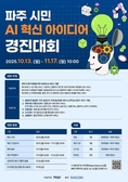 (플러스인뉴스) 파주시는 10월 13일부터 11월 17일까지 시민이 직접 참여하는 ‘파주 시민 인공지능(AI) 혁신 아이디어 경진대회’를 개최한다고 밝혔다. 이번 경진대회는 대한민국 국민 누구나 참여 가능하며, 인공지능(AI)을 활용해 행정과 시민 생활 속 다양한 문제를 해결할 수 있는 창의적 아이디어를 발굴하기 위한 시민 참여형 공모전으로, ‘인공지능(AI)과 함께하는 시민 중심의 파주, 인공지능(AI) 선도 도시’ 구현을 목표로 하고 있다. 개인 또는 팀 단위로 참가할 수 있으며, 참가자는 지정 주제(① 출판단지 활성화, ② 재해·재난 관리, ③ 동물 보호, ④ 도로 안전, ⑤ 교통 질서) 또는 자율 주제(파주시 현안 해결을 위한 생성형 인공지능(AI) 서비스 개발) 중 하나를 선택해 아이디어를 제출하면 된다. 예선은 온라인 방식으로 진행되며, 심사위원 평가 70%와 참가자 투표 30%를 합산해 상위 10개 팀이 본선에 진출한다. 본선은 현장 발표 형식으로 열리며, 창의성, 실현 가능성, 적합성, 인공지능(AI) 기술 활용성 등을 종합 평가해 최종 순위가 결정된다. 총 상금은 800만 원 규모로