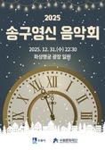 (플러스인뉴스) 수원문화재단은 오는 31일 오후 10시 30분부터 수원 화성행궁 광장 일원에서 2025년을 마무리하고 2026년 신년을 맞이하는 ‘2025 송구영신 음악회’를 개최한다. 이번 음악회에는 누구나 쉽게 즐길 수 있는 재즈 공연을 선보이는 5인조 재즈밴드 ‘리치파이’와 전통 타악의 역동적인 매력을 전달하는 ‘소리스’가 무대에 오른다. 또한 JTBC '싱어게인4'에서 ‘19호 가수’로 활약 중인 ‘이상웅’이 참여해 깊이 있는 무대를 선보일 예정이다. 수원문화재단 관계자는 “전통과 현대가 어우러진 다채로운 무대를 통해 시민들과 함께 한 해를 뜻깊게 마무리하고자 한다”며 “온 가족이 함께 따뜻한 새해를 맞이하시길 바란다”고 전했다. 한편, ‘2025 송구영신 음악회’가 펼쳐질 화성행궁 광장 옆 여민각에서는 새해맞이 경축 타종 행사도 진행될 예정이다. 이와 함께 화성행궁 광장에서는 떡국 나눔 행사도 함께 마련된다. 자세한 내용은 수원문화재단 홈페이지를 통해 확인할 수 있다. [뉴스출처 : 경기도 수원시]