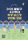 (플러스인뉴스) 수원시 팔달구가 청소년들이 직접 주인공이 되어 공연에 참여하고 즐기는 ‘2026 팔달구 우리동네 학생 버스킹’의 공연팀을 모집한다고 밝혔다. 이번 버스킹 공연은 청소년들에게 숨겨진 끼를 발산할 수 있는 무대를 제공하고, 지역 주민들과 함께 즐기는 건강한 청소년 문화를 확산하기 위해 마련됐다. 특히 청소년들이 주도적으로 참여하는 기회을 만든다는 점에서 의미가 깊다. 모집 기간은 오는 4월 27일부터 5월 8일까지 12일간 진행된다. 신청 대상은 수원시 또는 팔달구 관내 중·고등학교 학생들로, 노래나 악기 연주 등 버스킹이 가능한 팀이라면 누구나 지원할 수 있다. 참여를 원하는 학생들은 공연팀 신청서와 함께 3분 이내의 영상을 담은 동영상을 첨부하여 이메일로 접수하면 된다. 팔달구는 접수된 신청서와 영상을 심사하여 최종 6개 내외의 팀을 선발할 계획이며, 선정 결과는 5월 15일 구청 홈페이지를 통해 발표된다. 최종 선발된 팀들에게는 6월 13일 토요일 오후 4시, 수원시립미술관 뒤편에 위치한 제3호 역사공원 야외무대에서 팀장 약 15~20분 동안 공연을 펼칠 기회가 주어진다. &nbs