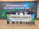 (플러스인뉴스) 파주시는 2월 25일 여의도 국회 국회의원회관에서 열린 ‘2026 대한민국 녹색기후상’ 시상식에서 자치부문 우수상을 수상했다. 대한민국 녹색기후상은 국회기후변화포럼이 주관하는 국내 대표 기후·에너지 분야 종합 시상으로, 기후변화 대응과 에너지 전환 실현에 기여한 지방정부, 공공기관, 기업, 시민단체 및 개인을 선정해 시상한다. 국회기후변화포럼에 따르면 2025년 12월 29일부터 2026년 1월 30일까지 총 7개 부문에 걸쳐 공모를 진행했으며, 자치부문에는 31개 지방정부가 응모했다. 예심과 본심을 거친 심사 결과, 파주시가 최종 수상기관으로 선정됐다. 이번 수상은 ▲국공유지를 활용한 공공 재생에너지 직접 전력구매계약(PPA) ▲분산에너지 특화지역 추진 ▲시민·소상공인·어린이를 대상으로 한 알이100(RE100) 교육 및 자문·상담 ▲전국 최초 알이100(RE100) 전담조직 및 조례 제정 등 ‘파주형 알이100(RE100)’ 정책이 종합적으로 인정받은 결과다. 파주시 관계자는 “이번 수상은 공공 재생에너지 직접 전력구매계약(PPA)과 기업 알이100(RE100) 대응 지원을 통해