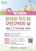 (플러스인뉴스) 수원특례시는 3월 11일 오후 2시부터 3시까지 북수원도서관 강당에서 ‘3월 일자리 두드림 구인·구직의 날’을 개최한다. 주식회사 명은간호전문요양원, 사회적협동조합 다우리, 수원효재활 주야간보호센터, (A+)경기미터케어_수원, 든든한 재가복지센터 등 복지 분야 5개 업체가 참여한다. 요양보호사, 근로지원인, 사회복지사, 산후관리원, 사회복지사 등을 채용한다. 채용 인원은 총 18명이다. 구인 기업과 구직자가 1대1 채용 면접을 한다. 수원시는 취업 정보를 제공하고, 이력서·면접 클리닉을 운영하는 등 참가자들을 지원한다. 일자리를 구하는 수원시민은 누구나 참여할 수 있다. 수원일자리센터가 주관하는 ‘일자리 두드림’은 취업에 어려움을 겪는 구직자와 인재 채용을 원하는 기업을 연결해 주는 채용 행사다. 올해는 접근성이 좋은 도서관과 연계‧협업해 행사를 열고 있다. 수원일자리센터는 일자리 두드림 외에도 직업상담사가 한 달에 두 차례(둘째·넷째 화요일 오후 1~6시) 4개 구 지정도서관을 찾아가는 ‘찾아가는 일자리 상담’을 운영해 구직자들에게 취업 정보를 제공하고, 1대1 취업