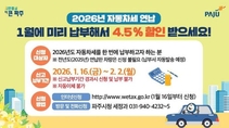 (플러스인뉴스) 파주시는 2026년도 자동차세를 1월에 한 번에 납부하는 경우 세액공제 혜택을 받을 수 있는 자동차세 연납 신청·납부를 2월 2일까지 접수한다고 밝혔다. 자동차세는 매년 6월과 12월 2회에 걸쳐 부과되는 후납적 성격의 세금이나, 1월에 연세액을 한번에 납부하는 경우 4.5%를 공제받을 수 있어 납세자의 세 부담을 줄일 수 있다. 특히 1월 연납은 연중 가장 높은 공제율이 적용돼 절세 효과가 크다. 자동차세 연납은 1월 외에도 3월, 6월, 9월에도 신청이 가능하지만, 공제율은 각각 연세액의 3.7%, 2.5%, 1.2%로 점차 낮아진다. 또한 연납 후 차량의 소유권이 이전되거나 폐차·말소되는 경우에는 소유 기간을 제외한 잔여기간에 대한 자동차세를 환급받을 수 있다. 자동차세 연납은 신고·납부가 원칙이지만, 파주시는 납세 편의를 위해 지난해 자동차세를 연납한 차량에 대해서는 별도의 신청 없이 연납 납부서를 발송할 예정이다. 다만, 지난해 연납하지 않았거나 차량을 새로 취득한 경우에는 ▲위택스를 통해 신청하거나, 파주시청 세정과 방문 또는 전화를 통해 자동차세 연납 신청을 할 수 있다.