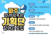(플러스인뉴스) 파주시는 청년이 직접 기획하고 운영하는 ‘제5회 파주 청년희망축제’의 성공적인 개최를 위해 오는 26일까지 ‘파주 청년희망축제 기획단’을 모집한다. ‘청년희망축제 기획단’은 축제의 주제 설정부터 프로그램 구성, 홍보, 현장 운영까지 전 과정에 참여하는 조직으로, 청년의 시각과 참신한 생각을 축제에 반영하기 위해 운영된다. 모집 인원은 10명 내외로, 파주시에 주민등록을 두고 있거나 파주시 소재 학교·직장·단체 등에서 활동 중인 19~39세 이하 청년이라면 누구나 신청할 수 있다. 신청은 파주시청 누리집을 통해 가능하며, 지원 신청서와 개인정보 수집·이용 동의서 등 필수 서류를 제출해야 한다. 시는 서면 심사를 통해 신청자의 참여 의지와 활동 경험 등을 종합적으로 검토해 최종 참여자를 선발할 계획이다. 기획단으로 선정된 청년들은 3월부터 11월까지 활동하며, 정기 회의를 통해 축제 주제와 프로그램을 기획하는 등 다양한 역할을 수행하게 된다. 기획단 구성원에게는 파주시장 명의의 위촉장이 수여되며, 회의 참석 시 소정의 활동 수당이 지급된다. 또한 전체 활동의 일정 비율 이상 참여한 경우 활동 인증서