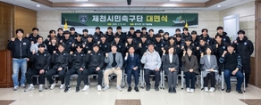 (플러스인뉴스) 제천시민축구단 선수단과 구단주의 공식 대면식이 지난 11일 제천시청에서 열렸다. 오는 24일 창단식을 앞두고 열린 이번 대면식에는, 구단주인 김창규 제천시장과 김용기 단장, 선수단 등 관계자들이 참석했다. 선수와 코치진 구성을 마친 제천시민축구단은 구단주와 공식적으로 첫인사를 나누고, 팀의 운영 방향과 시즌 목표를 공유했다. 대면식은 선수단과 코치진 소개, 이번 시즌 운영 계획과 목표 발표, 질의응답 순으로 진행됐다. 김창규 제천시장은 인사말을 통해 선수단을 격려하며, “제천시를 대표하는 시민구단으로서 책임감을 가지고 모든 경기에 최선을 다해달라”고 당부했다. 김용기 단장은 구단 운영 방침과 비전을 소개하며, “제천시와의 협력을 바탕으로 투명하고 신뢰받는 구단을 만들어가겠다”라고 의지를 밝혔다. 한상구 감독은 “2026시즌 목표로 K4리그 상위권 진입과 리그컵 및 코리아컵 3라운드 이상 진출, 충청북도 대표 선발전 승리를 통한 전국체전 우승에 도전하겠다”라며 각오를 밝혔다. 공격수 손주원 선수는 개인 목표를 밝히며, “매 경기 공격 포인트를 기록해 팀에 기여하겠다”라며