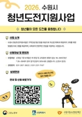 (플러스인뉴스) 수원시청소년청년재단 수원시청년지원센터는 취업 준비 과정에서 어려움을 겪고 있는 청년을 대상으로 ‘2026 수원시 청년도전지원사업’ 참여자 130명을 모집한다고 6일 밝혔다. 청년도전지원사업은 구직활동을 중단했거나 취업 준비에 어려움을 겪는 청년들이 다시 취업에 도전할 수 있도록 고용노동부가 지원하고 수원시가 운영하는 사업이다. 이번 사업에 참여하는 청년들은 밀착 상담과 사례관리, 자신감 회복 프로그램, 진로 탐색 및 취업역량 강화 교육 등 맞춤형 프로그램을 지원받게 된다. 특히 프로그램을 성실히 이수할 경우 최대 350만원의 참여수당 및 취업 인센티브가 지급돼 취업 준비 과정에서 발생하는 경제적 부담을 덜 수 있다. 참여를 희망하는 청년은 고용24 또는 수원청년포털을 통해 신청할 수 있다. 수원시청년지원센터 관계자는 “취업 준비 과정에서 어려움을 겪는 청년들이 다시 사회와 연결될 수 있도록 다양한 맞춤형 프로그램을 지원할 계획”이라며 “많은 청년들의 관심과 참여를 기대한다”고 말했다. [뉴스출처 : 수원시청소년청년재단]