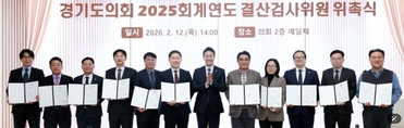 (플러스인뉴스) 경기도의회는 12일 예담채에서 2025회계연도 결산검사위원 위촉식을 개최했다. 이번에 위촉된 결산검사위원은 총 13명으로, 김도훈(국민의힘, 비례)·이호동(국민의힘, 수원8)·임창휘(더불어민주당, 광주2) 의원을 비롯해 재정·회계 분야에 풍부한 경험과 전문성을 갖춘 공인회계사 3명, 세무사 3명, 시민사회단체 관계자 1명, 재무·예산 전문가 3명 등으로 구성됐다. 결산검사위원들은 오는 4월 16일부터 5월 15일까지(30일간) 경기도 및 경기도교육청, 산하 공공기관을 대상으로 지방재정 관련 법령과 회계절차에 따라 예산이 적정하게 집행됐는지 여부와 재정운영의 효율성, 낭비 사례 등을 종합적으로 검사·분석하여 결산검사의견서를 작성할 예정이다. 대표위원을 맡은 김도훈 위원은 “이번 결산검사를 통해 예산 집행의 적법성과 효율성을 면밀히 살펴보고, 보다 건전하고 투명한 재정운영을 위한 개선방안을 제시할 수 있도록 최선을 다하겠다”고 밝혔다. 김진경 의장(더불어민주당, 시흥3)은 “예산안 심의가 한 해의 정책 방향을 정하는 설계라면, 결산검사는 그 목적이 제대로 달성됐는지 확인하는 완성의 단계